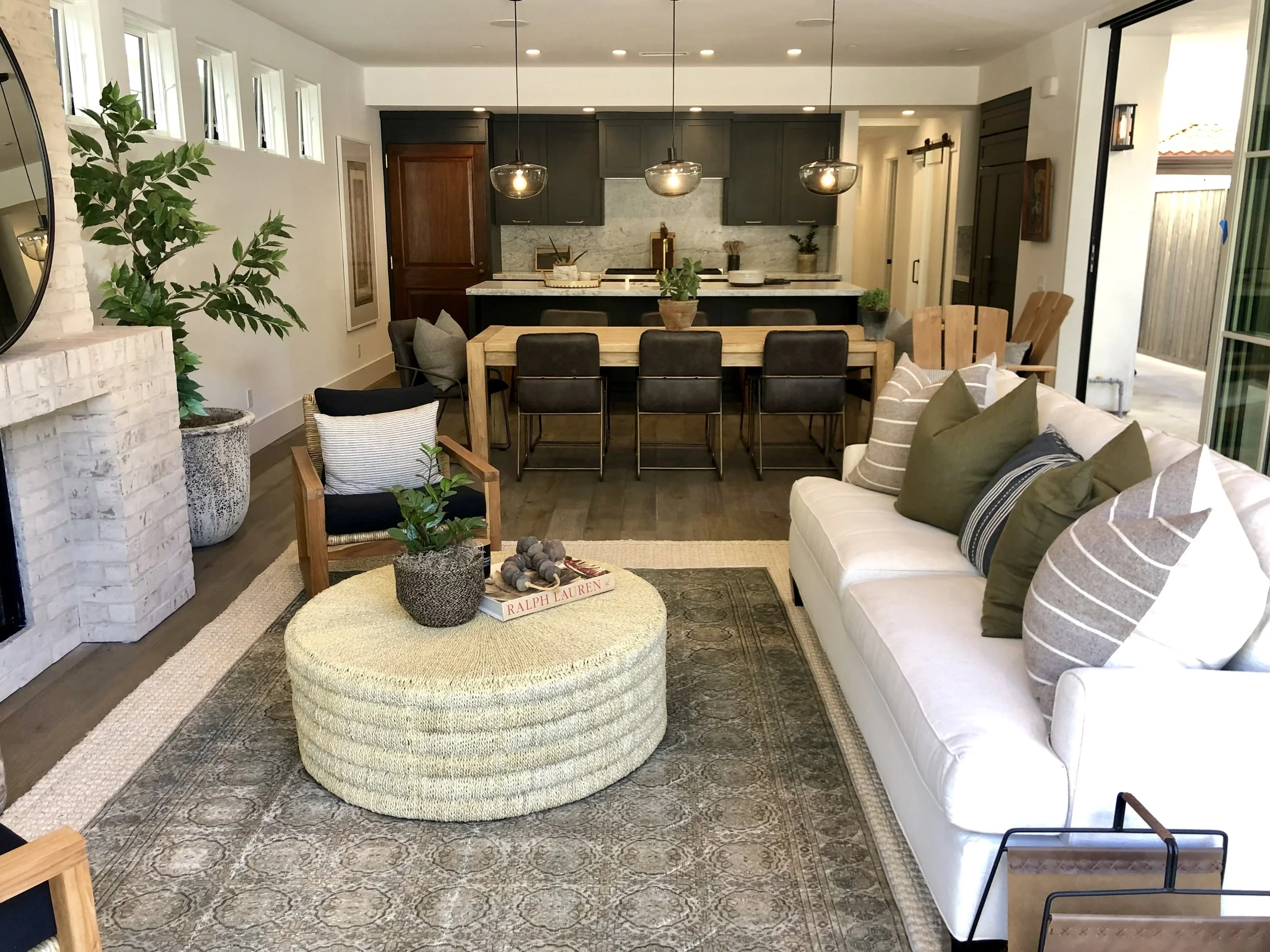 Living room with a white sectional sofa, black pillows, a round black coffee table with a potted plant, and woven chairs on a beige rug, with large windows and sliding doors opening to an outdoor space.
